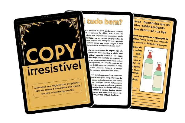 O e-book Copy Irresisível te mostra a parte teórica e prática dessas estratégias, para que fique ainda mais fácil você implementar e garantir o lucro que sempre quis. Imagine o cenário: Usar estratégias e métodos validados por marcas como Dove, Netflix, Mcdonalds, Uber e muitas outras empresas conhecidas.